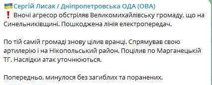 07.52 Ночью РФ обстреляла Великомихайловскую громаду в Синельниковском районе Днепропетровской области. Повреждена линия электропередач.