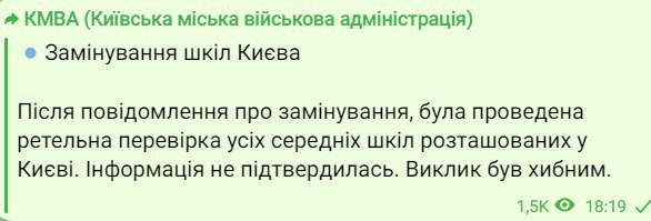 18.25 Информация о минировании киевских школ оказалась ложной. Об этом сообщила КГГА после проверки всех школьных зданий.