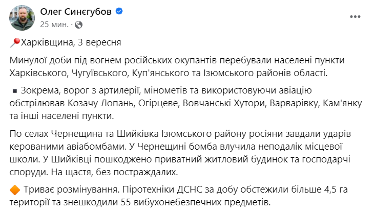 "В частности, враг из артиллерии, минометов и используя авиацию обстреливал Казачью Лопань, Огурцово, Волчанские Хутора, Варваровку, Каменку и другие населенные пункты", - написал Синегубов.
