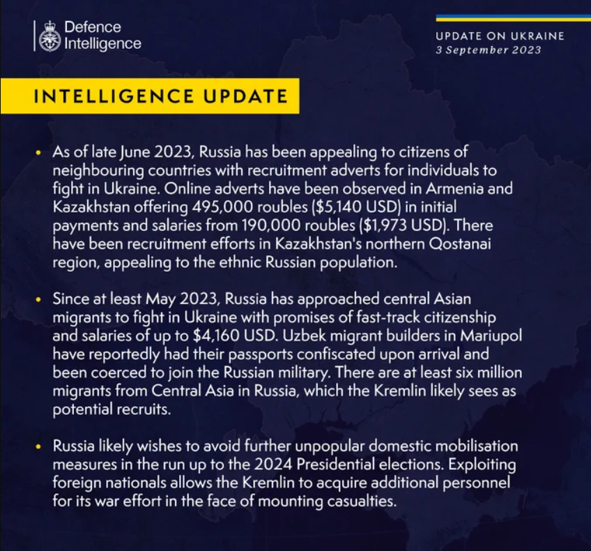 Кроме того, с мая 2023 года Россия предлагает мигрантам из Центральной Азии воевать на Украине, обещая ускоренное получение гражданства и зарплату до 4160 долларов США.
