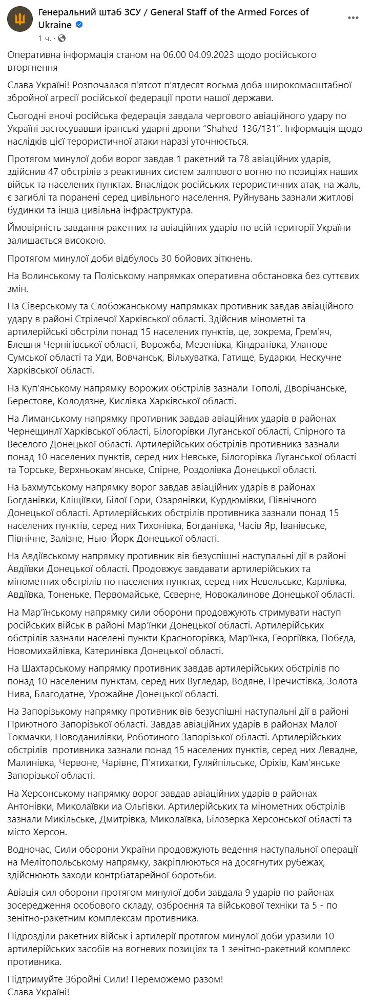 За прошедшие сутки враг нанес 1 ракетный и 78 авиационных ударов, совершил 47 обстрелов из реактивных систем залпового огня по позициям наших войск и населенным пунктам. В течение суток произошло 30 боевых столкновений.