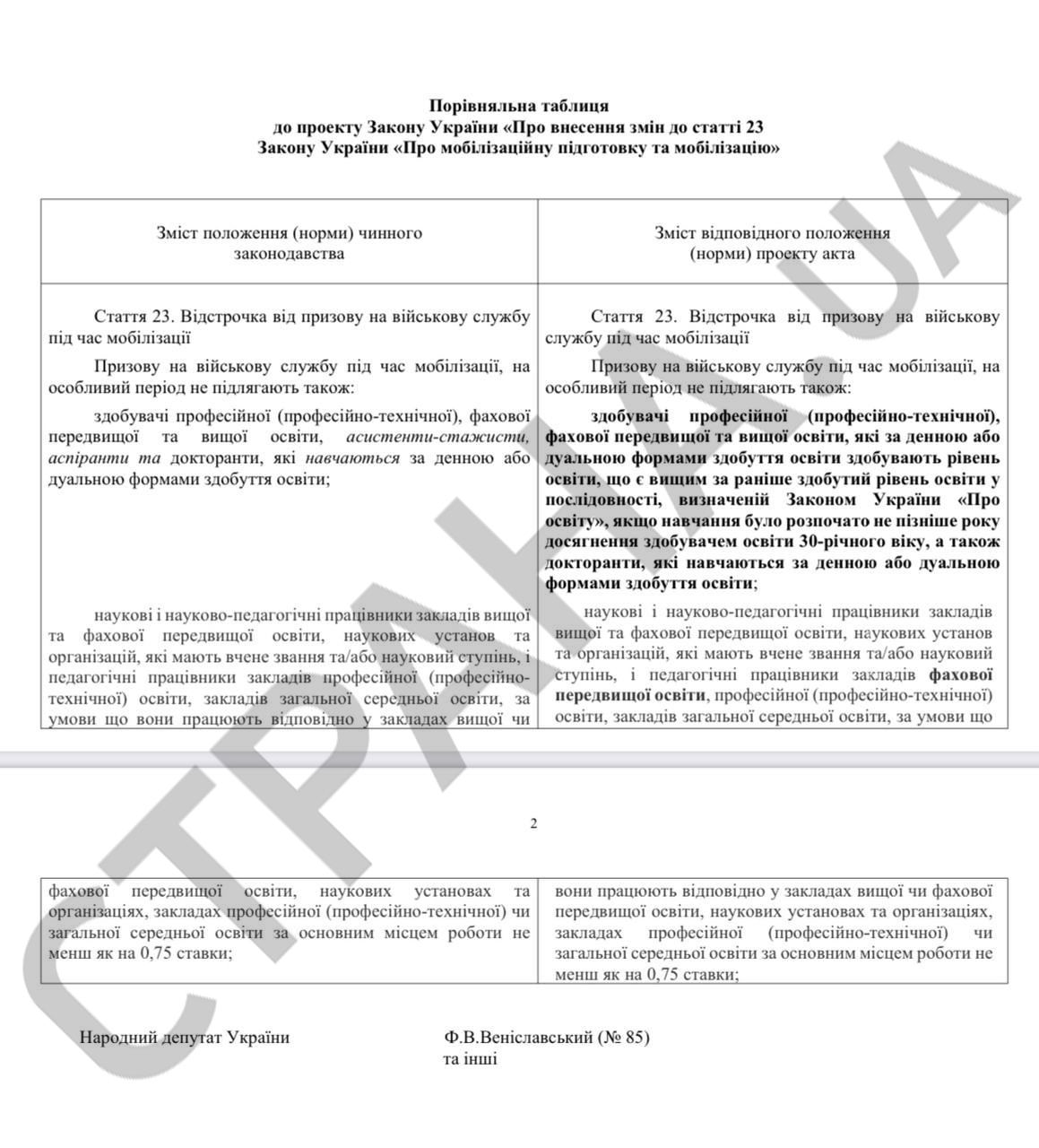На сайте Верховной Рады появился текст законопроекта представителя президента в парламенте Федора Вениславского, который предлагает отменить отсрочку от мобилизации для соискателей второго высшего образования (это распространенная схема "откоса" от мобилизации).