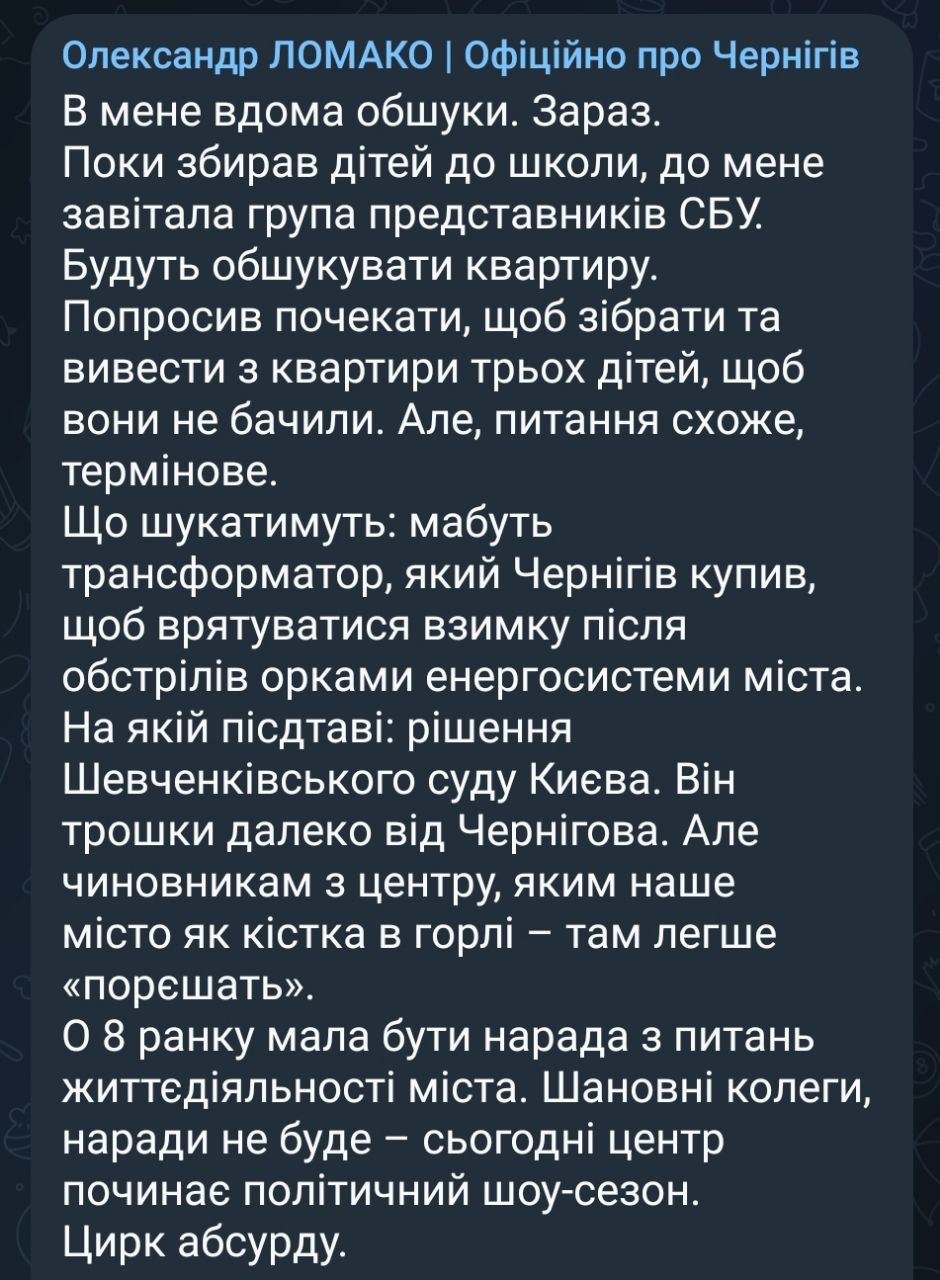 СБУ проводит обыски у исполняющего обязанности мэра Чернигова Александра Ломако.