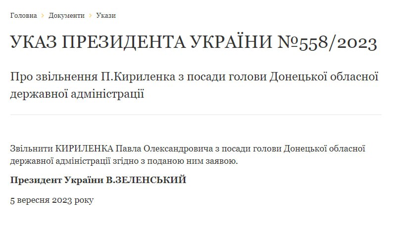 "Уволить Кириленко Павла Александровича с должности председателя Донецкой областной государственной администрации согласно поданному им заявлению", - написано в тексте указа.