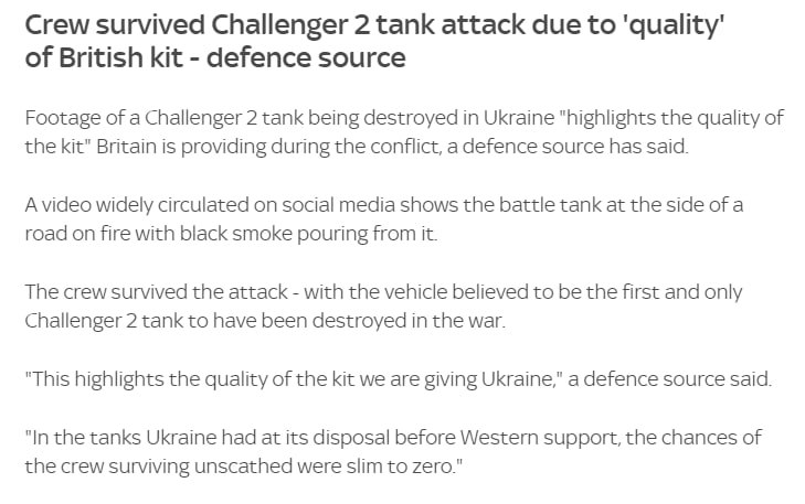 Ранее российские телеграм-каналы заявили, что в Украине впервые был подбит британский танк "Челленджер"