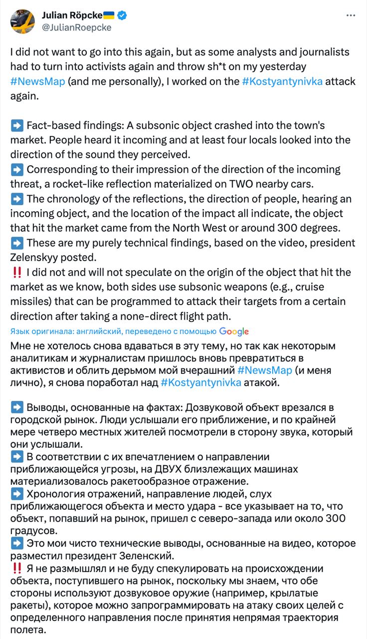 11:50 Военный обозреватель немецкого BILD Юлиан Рёпке утверждает, что ракета вчера прилетела в Константиновку с северо-запада. То есть со стороны территории, подконтрольной Украине.