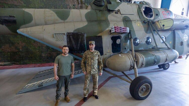 Президент Украины Владимир Зеленский и глава военной разведки Кирилл Буданов сфотографировались на фоне российского вертолета Ми-8, который, по заявлению ГУР, перегнал в Украину российский пилот.