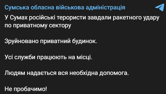 "В Сумах российские террористы нанесли ракетный удар по частному сектору", - говорится в сообщении.
