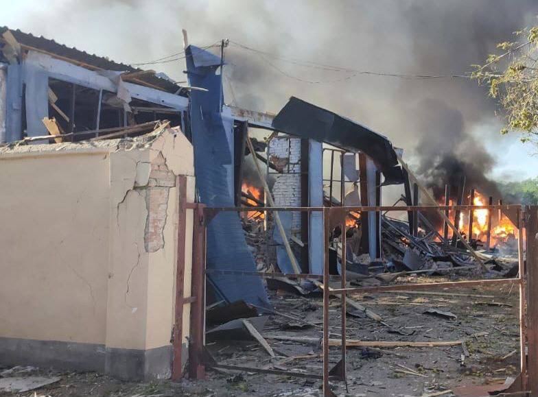 "Ракета попала в админздание. Предварительно, 1 погибший и 9 пострадавших. 3-х достали из-под завалов. Загорелись гаражи. Огонь охватил 200 кв. м.". - говорится в сообщении.