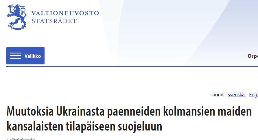 После начала войны Финляндия приняла решение предоставлять защиту и гражданам третьих стран, которые покинули Украину из-за войны, но до того не имели международной защиты или постоянного вида на жительство в Украине.