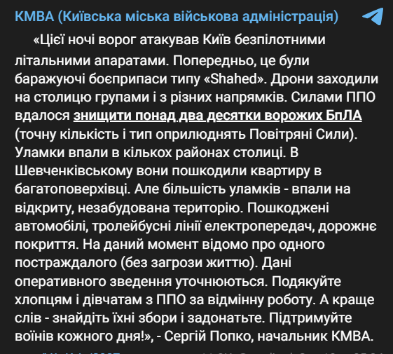 "Этой ночью враг атаковал Киев беспилотными летательными аппаратами. Предварительно это были баражирующие боеприпасы типа "Shahed". Дроны заходили в столицу группами и по разным направлениям. Силами ПВО удалось уничтожить более двух десятков вражеских БПЛА (точное количество и тип обнародуют Воздушные Силы)", - сообщил начальник КГВА Сергей Попко.