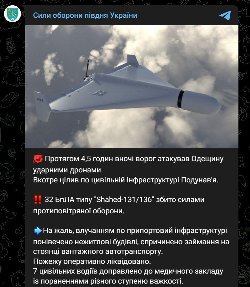 Было сбито 32 дрона, но есть попадание по припортовой инфраструктуре.