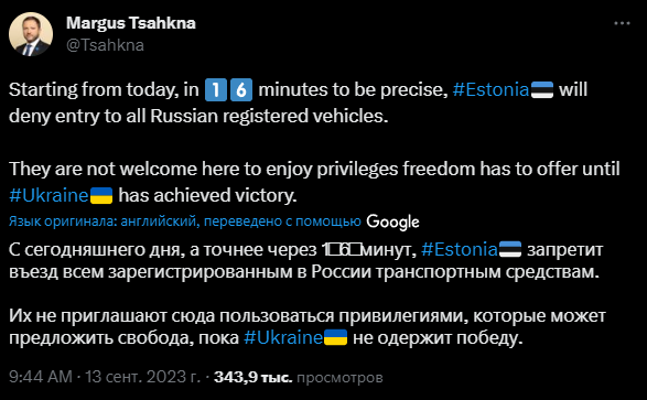 Эстония 13 сентября с 10 утра запретила въезд в страну частных автомобилей с российскими номерами, поскольку они подпадают под действие санкций Евросоюза.