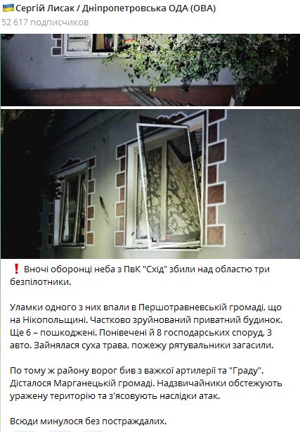 07.35 Ночью над Днепропетровской областью сбили три беспилотника.