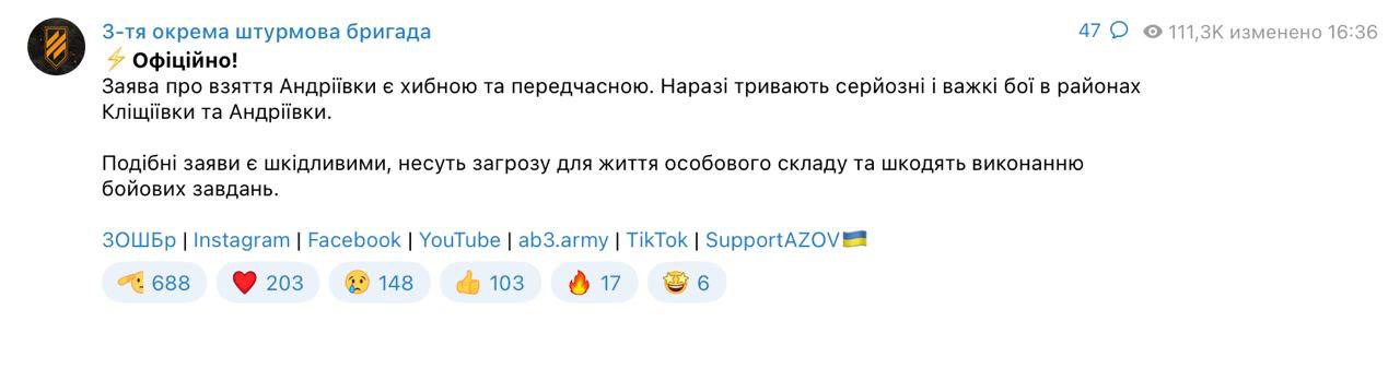 16.43 3-я ОШБр, которая воюет сейчас на бахмутовском направлении, сообщает, что заявление замминистра обороны Маляр об освобождении Андреевки под Бахмутом является «ошибочным и преждевременным».