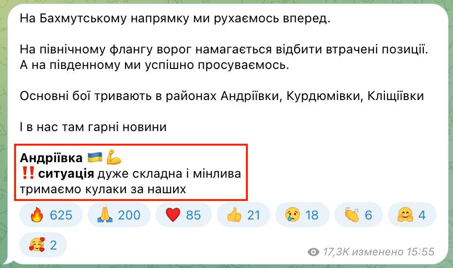 16.04 ВСУ освободили Андреевку - село на южном фланге Бахмута около Клещеевки, сообщила Анна Маляр.