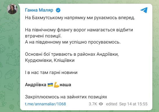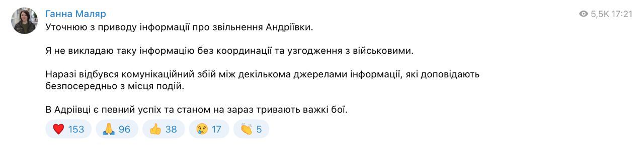 Позже Маляр написала еще один пост, в котором заявила, что опубликовала сообщение об освобождении Андреевки после согласования с военными, но произошел "коммуникационный сбой"».