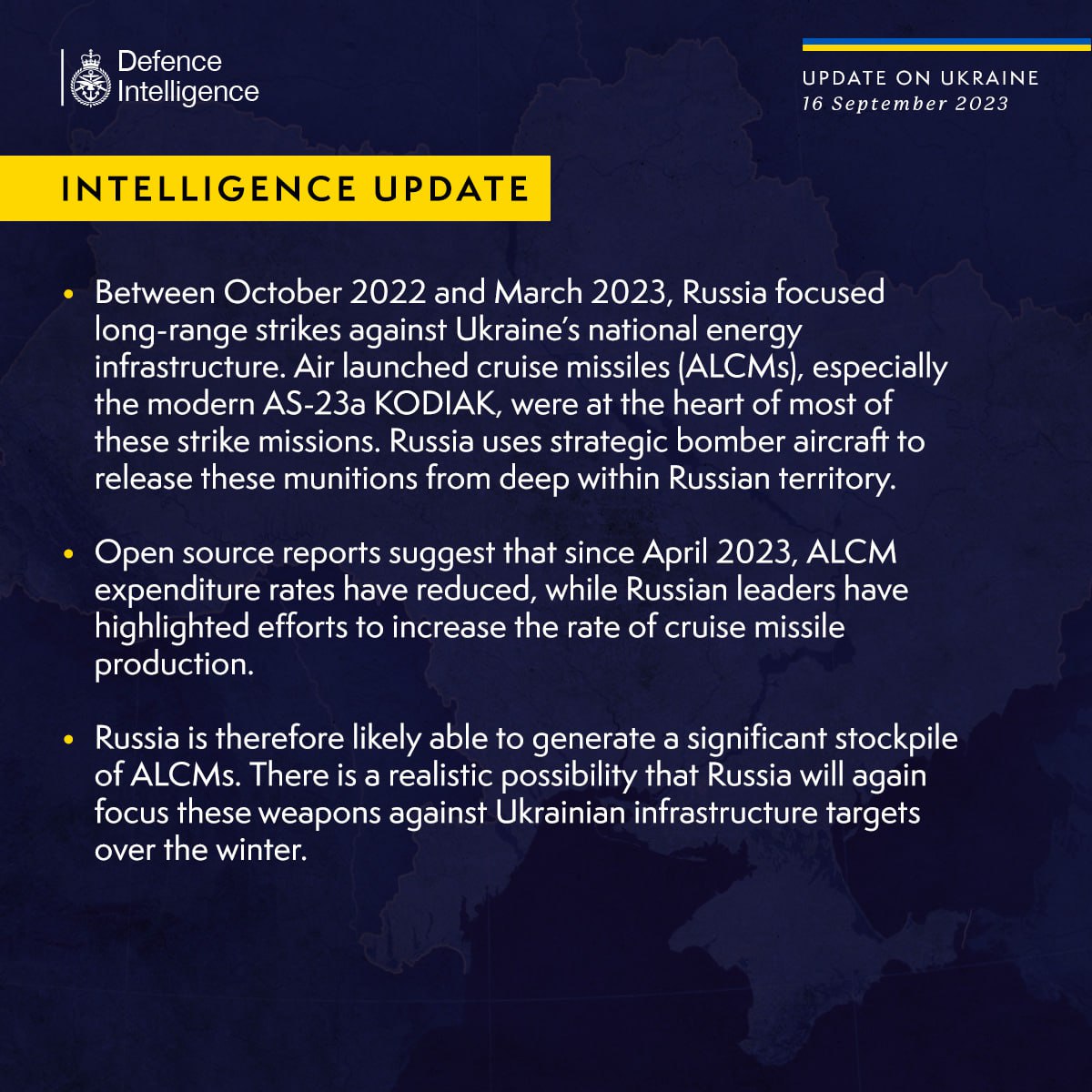 "Таким образом, Россия, вероятно, сможет создать значительный запас крылатых ракет воздушного базирования. Существует реальная вероятность того, что зимой Россия снова направит это оружие против объектов украинской инфраструктуры", - пишет британская разведка.