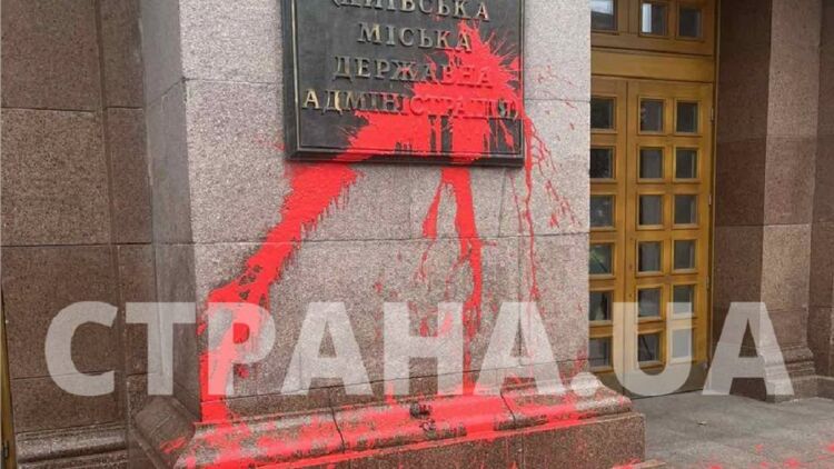 Появилось фото красной краски на главном входе в Киевскую городскую государственную администрацию (КГГА). По данным "Страны", полиция задержала того, кто это сделал. Краску до сих пор не отмыли.