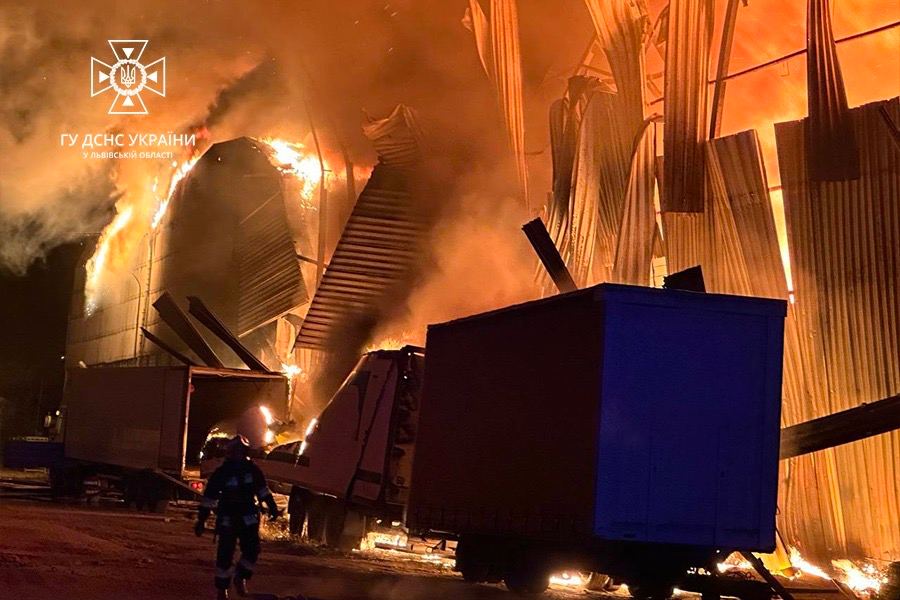 Около 5:30 во Львове раздались взрывы. Город был атакован дронами-камикадзе. В результате удара на территории города произошло возгорание на крыше промышленного склада.