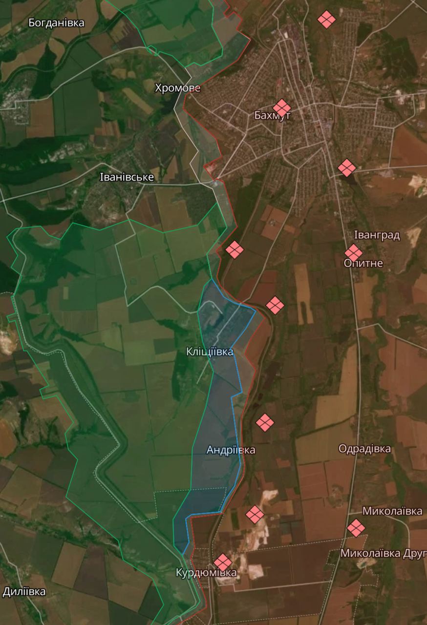 Южнее Бахмута Россия также пытается безуспешно отбить потерянные позиции в Андреевке и Клещеевке. Сообщается, что и ВСУ там ведут штурмовые действия.
