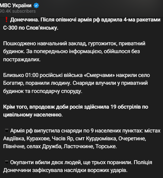 Также "Смерчами" накрыли село Богатырь. Снаряды попали в частный дом и хозяйственное сооружение, ранен человек.