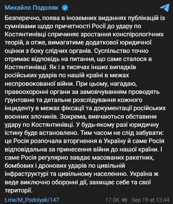 Советник главы Офиса президента Михаил Подоляк прокомментировал расследование The New York Times, где утверждается, что удар по Константиновке могла нанести украинская ракета.