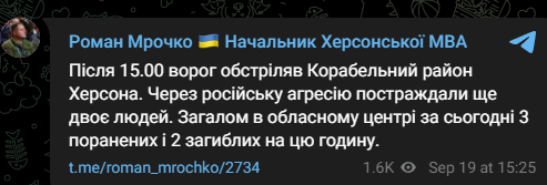 "После 15:00 враг обстрелял Корабельный район Херсона. Из-за российской агрессии пострадали еще два человека", – отметил Роман Мрочко.