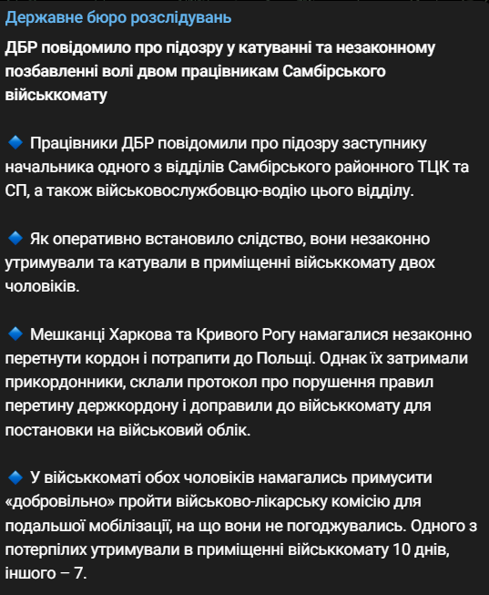 После публикации видео ГБР задержало двух сотрудников военкомата Самбора, которые избивали незаконно удерживаемого мужчину. Он находился в ТЦК с 12 сентября. Его морили голодом, избивали и издевались, чтобы он "добровольно" прошёл военно-врачебную комиссию и отправился в армию.