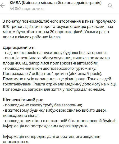 Киевская городская военная администрация (КГВА) опубликовала сводку о последствиях новой ракетной атаки на столицу в четверг, 21 сентября.