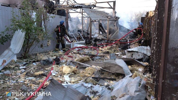 МВД также публикует видео последствий прилета обломков ракет по промышленному предприятию в Киеве.