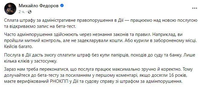 Федоров подчеркнул, что сервис "Дия" предоставляет уникальную возможность быстро и без лишних хлопот оплатить штраф за административное нарушение. Пока услуга доступна в тестовом режиме. Основной целью тестирования является проверка работоспособности услуги и ее максимальной удобности и корректности.