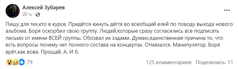 "Боря оскорбил свою группу. Людей, которые сразу согласились все подписать письмо от имени ВСЕЙ группы. Обозвал их зэдами. Думаю, единственная причина то, что есть вопросы, почему нет полного состава на концертах. Отмазался. Манипулятор. Боря врёт, как Вова. Прощай, А. И б." – написал Зубарев.