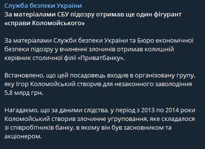 Установлено, что это должностное лицо входило в организованную группу, которую Игорь Коломойский создал для незаконного завладения 5,8 млрд грн.
