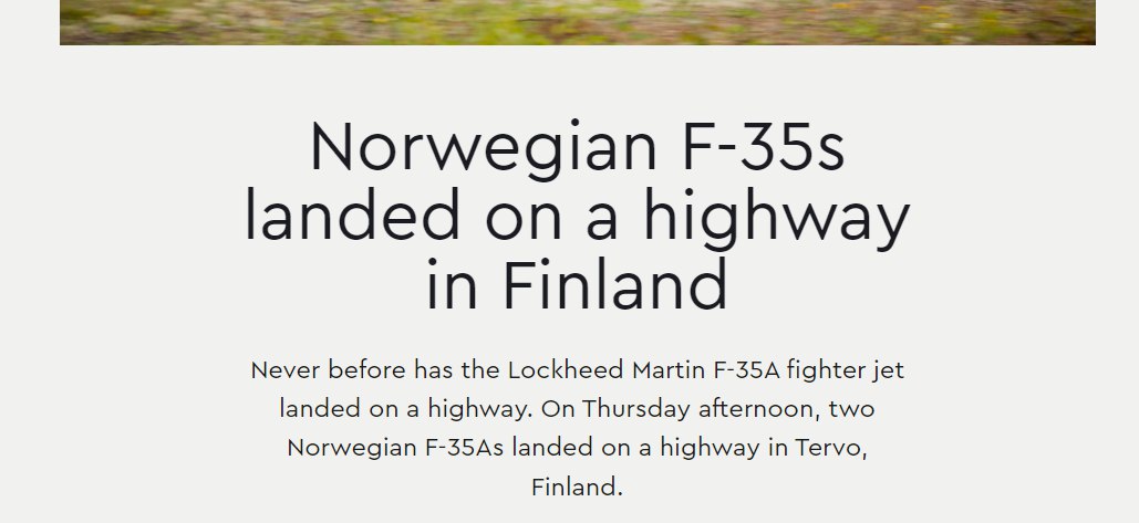 Два норвежских истребителя F-35 выполнили посадку для дозаправки на шоссе в районе финского города Терво. Он расположен примерно в 215 км от российской границы.