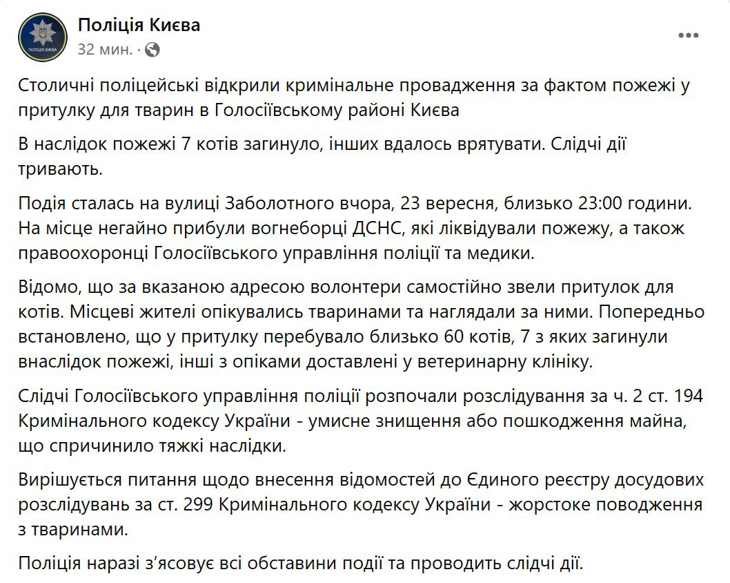 Киевская полиция открыла уголовное дело после вероятного поджога кошачьего приюта.