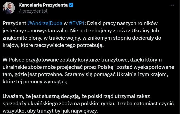 Президент Польши Анджей Дуда заявил, что решение ввести односторонний запрет на импорт украинской агропродукции было правильным, так как польские фермеры обеспечивают продовольственную безопасность страны.