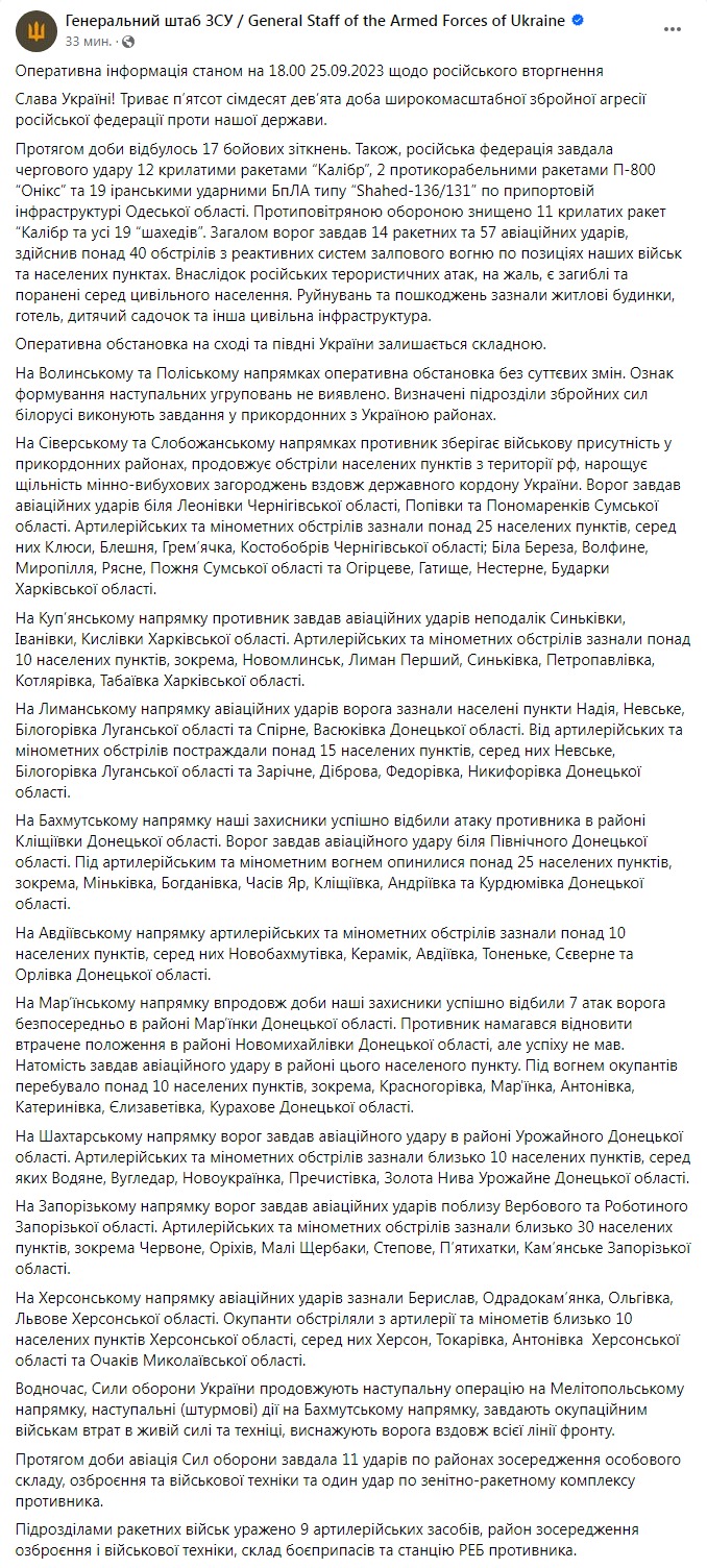 Генеральный штаб ВСУ опубликовал оперативную информацию о ситуации на фронте по состоянию на 18:00 25 сентября.