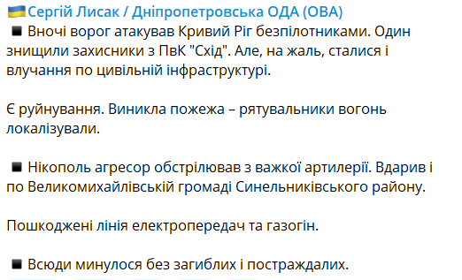 "Ночью враг атаковал Кривой Рог беспилотниками. Один уничтожили защитники из ПВК "Восток". Но, к сожалению, произошли и попадания по гражданской инфраструктуре", - написал Лысак.