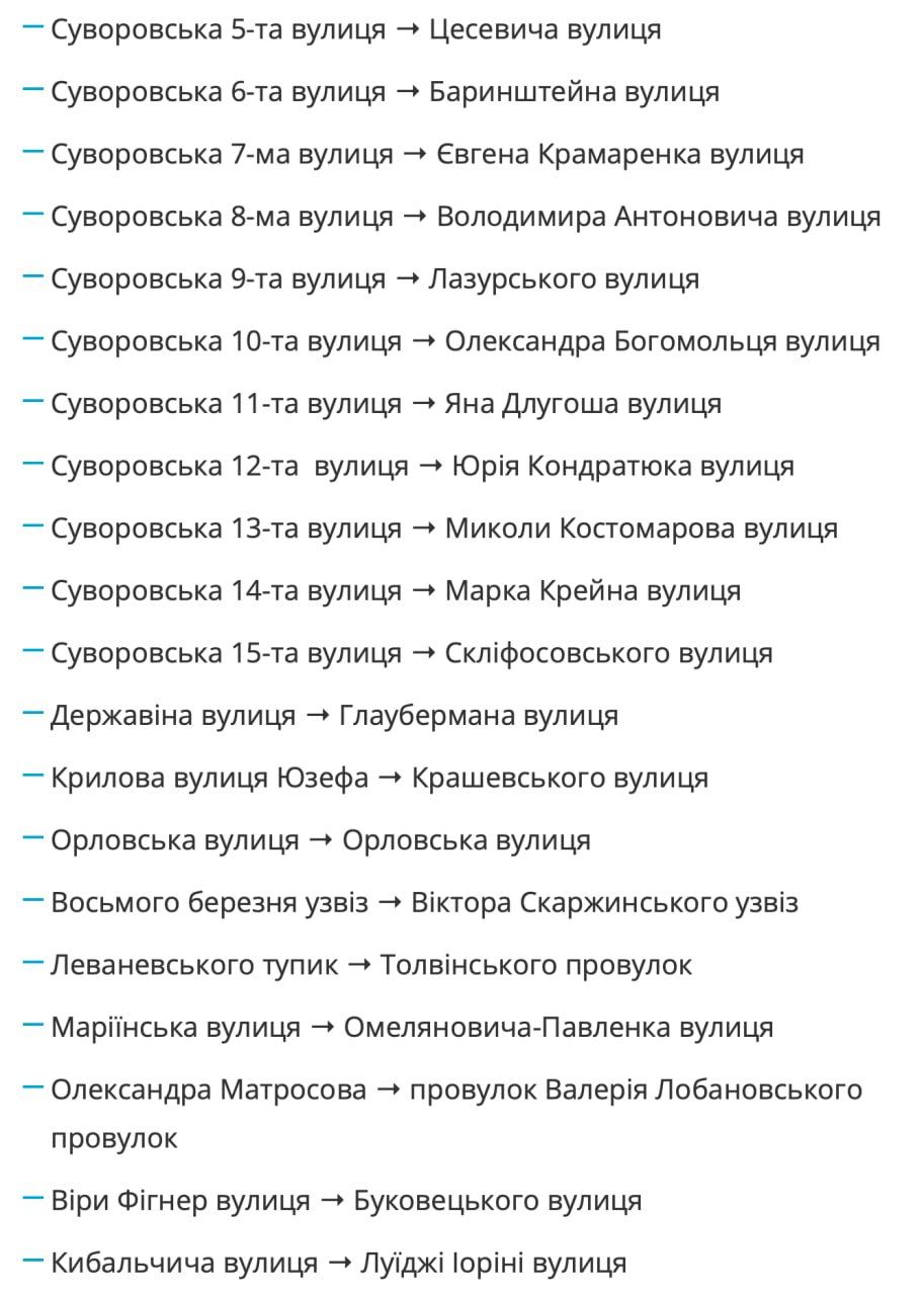 Остальные топонимы, вероятно, будут переименованы. В частности, 10-я Суворовская улица станет Богомольца, Донского - Дмитреевской, переулок Шолохова - Волокидина. Полный список - на изображении.