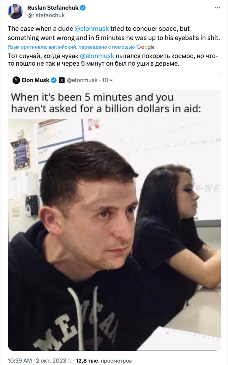 Напомним, сегодня Илон Маск опубликовал мем с лицом, похожим на Владимира Зеленского, и подписью "Когда ты уже пять минут не просил миллиарда долларов помощи".