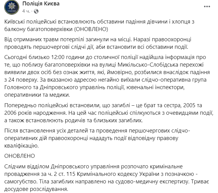Ранее мы писали, что в Киеве две 12-летние девочки совершили самоубийство, прыгнув с 15-го этажа. Их обнаружили мертвыми на улице Михаила Драгоманова. Следователи квалифицировали произошедшее как самоубийство. Устанавливаются все детали трагедии.