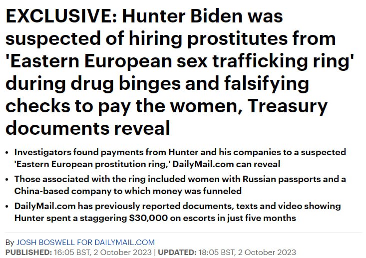 Сына президента США Хантера Байдена подозревали в найме проституток из "восточноевропейской сети секс-торговли" во время его нарковечеринок.