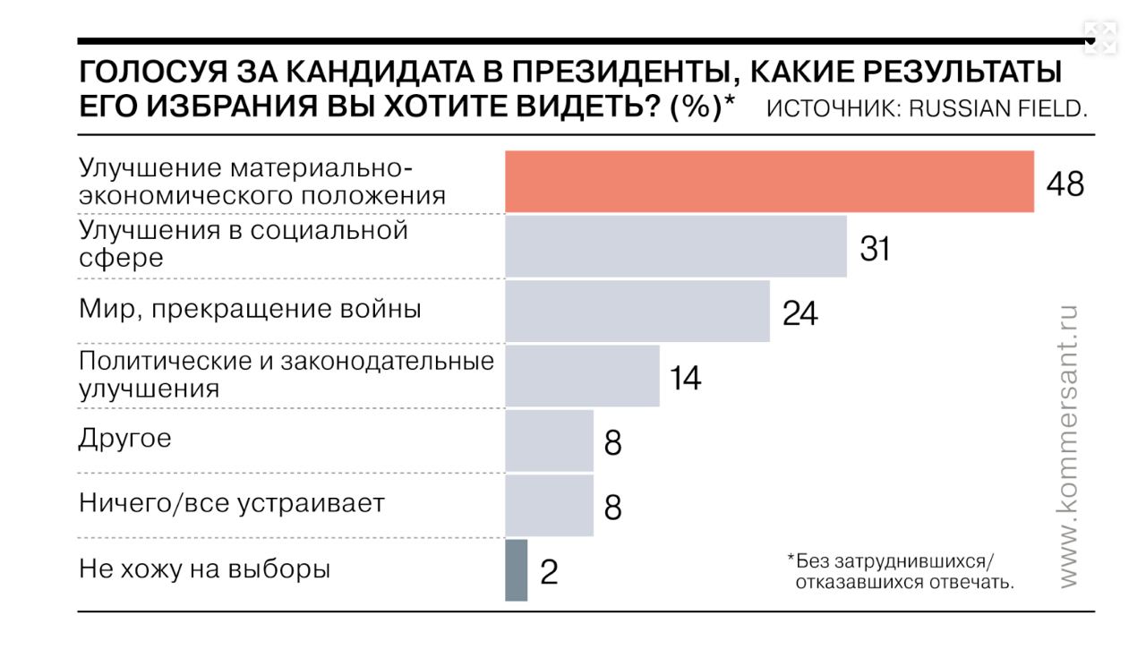 Россияне ожидают от будущего победителя выборов президента РФ в марте в первую очередь повышения своего материального благополучия, улучшения ситуации в социальной сфере и завершения войны в Украине.