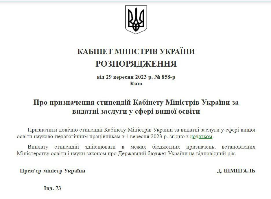 Соответствующее распоряжение "О назначении стипендий Кабинета министров Украины за выдающиеся заслуги в сфере высшего образования" от 29 сентября 2023 года опубликовано на сайте Кабинета министров Украины.