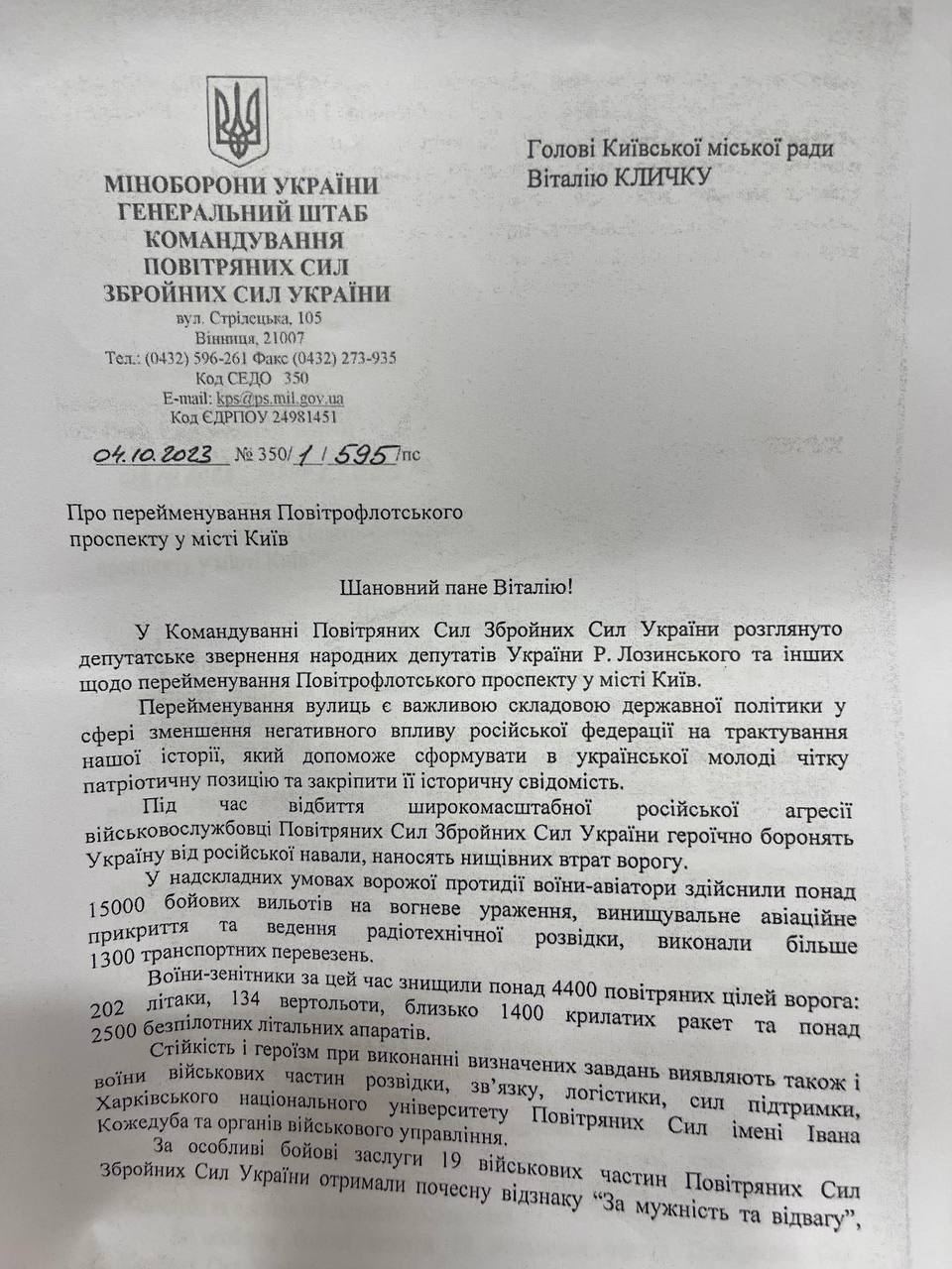 Командование Воздушных сил предлагает переименовать Воздухофлотский проспект в Киеве на проспект Воздушных сил.