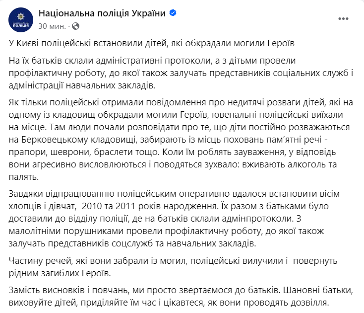 В Киеве задержали детей, которые обворовывали могилы военных. Фото: Нацполиция Украины