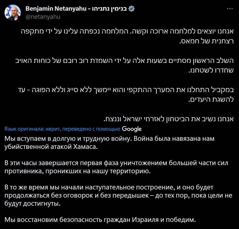 "Мы вступаем в долгую и трудную войну. Война была навязана нам убийственной атакой Хамаса. В эти часы завершается первая фаза уничтожением большей части сил противника, проникших на нашу территорию. В то же время мы начали наступательное построение, и оно будет продолжаться без оговорок и без передышек – до тех пор, пока цели не будут достигнуты. Мы восстановим безопасность граждан Израиля и победим", - заявил Беньямин Нетаньяху.