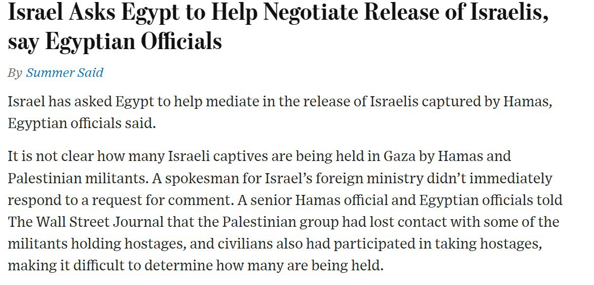 Израиль попросил Египет помочь освободить заложников, захваченных ХАМАСом