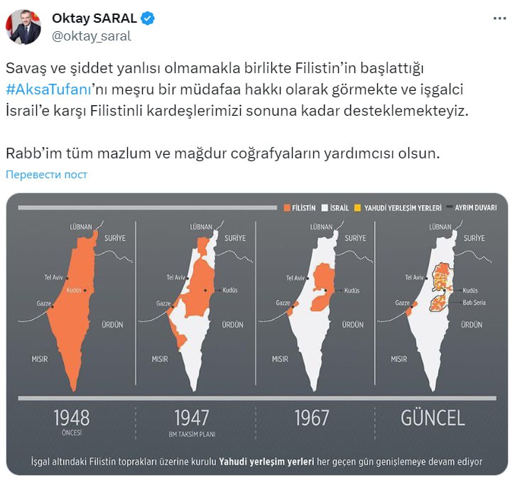 Советник президента Турции Октай Сарал заявил о поддержке палестинцев в войне с Израилем.